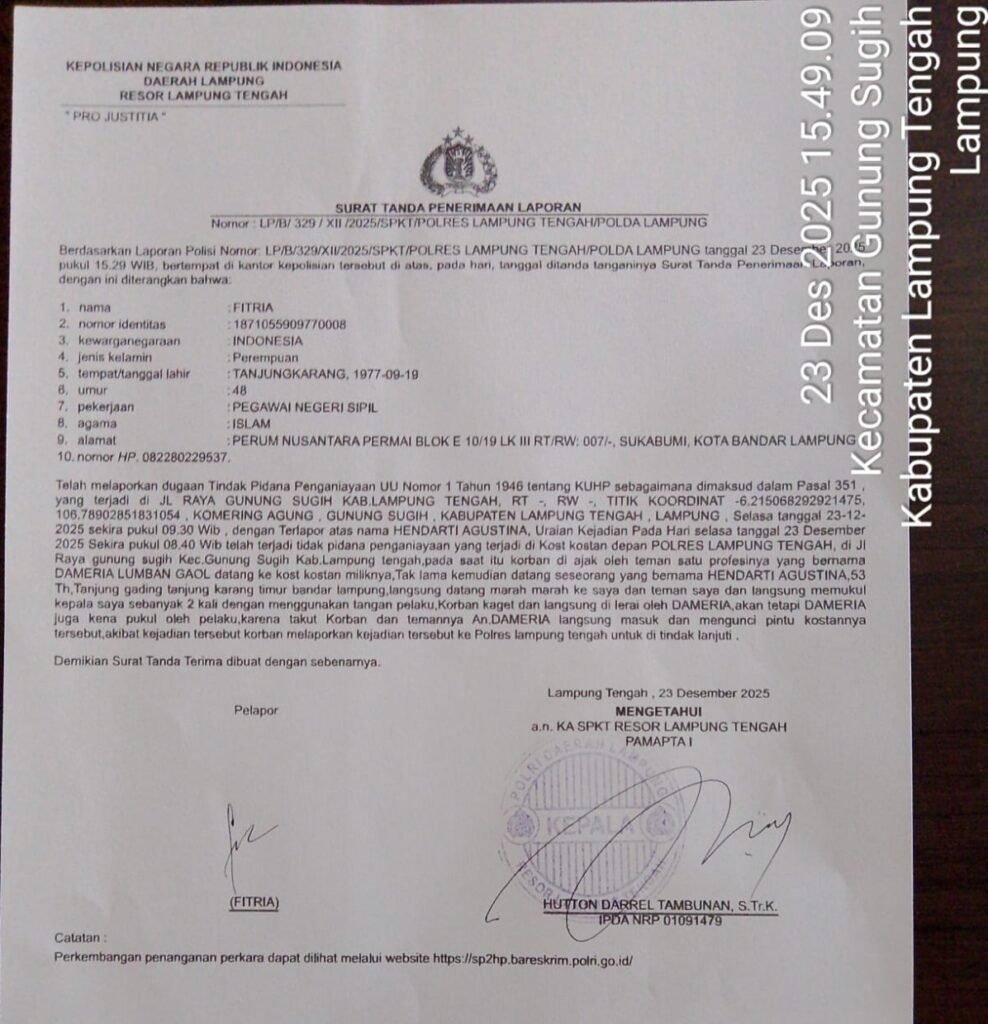Laporan tersebut tercatat secara resmi dengan Nomor: LP/B/329/XII/2025/SPKT/Polres Lampung Tengah/Polda Lampung. Selanjutnya, kepolisian mencatat laporan tersebut sebagai dasar penyelidikan.