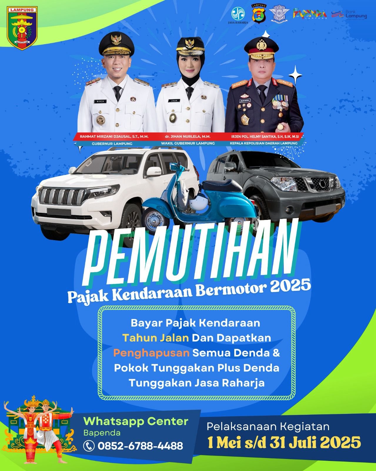 Pemerintah Provinsi (Pemprov) Lampung secara resmi mengumumkan program Pemutihan Pajak Kendaraan Lampung 2025. Program ini akan berlangsung dari 1 Mei hingga 31 Juli 2025 dan berlaku untuk seluruh jenis kendaraan bermotor, baik roda dua, empat, maupun enam.