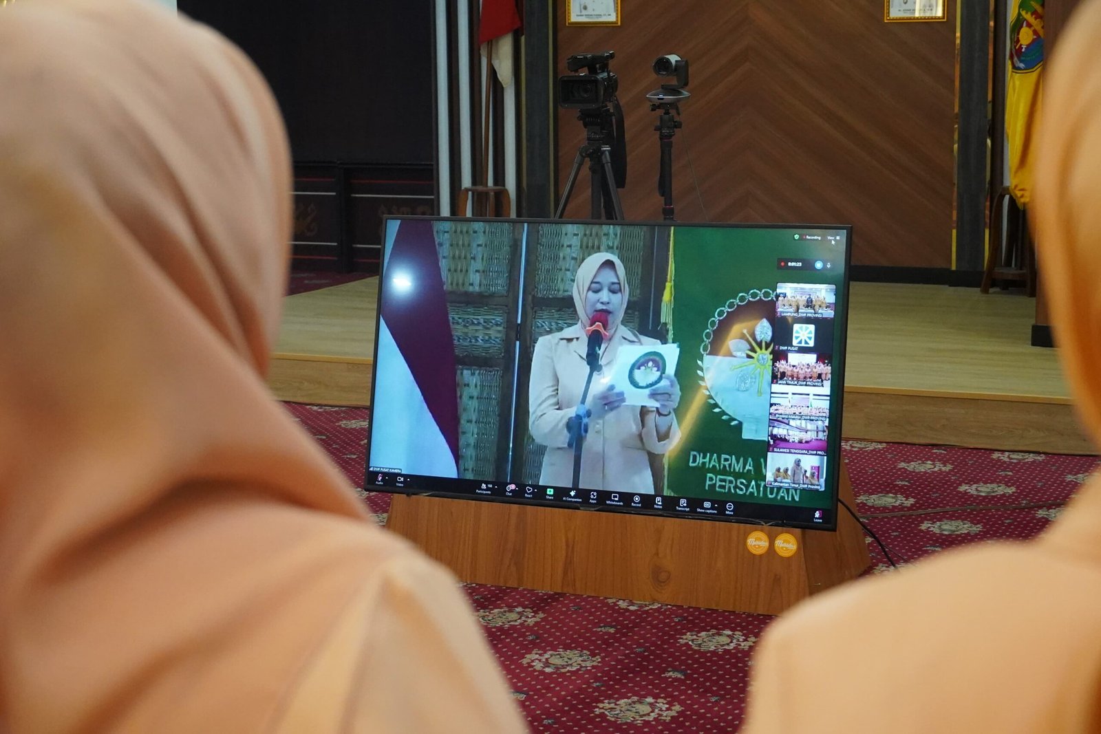 Pj. Sekretaris Daerah Provinsi Lampung, M. Firsada, didampingi Pj. Ketua Dharma Wanita Persatuan Provinsi Lampung, Hanita Firsada, serta Penasehat DWP Provinsi Lampung, Purnama Wulan Sari Mirza, menghadiri acara Pengukuhan dan Pelantikan Pengurus DWP seluruh Indonesia secara virtual di Ruang Abung Balai Keratun Lt.1, Kamis (15/5/2025).