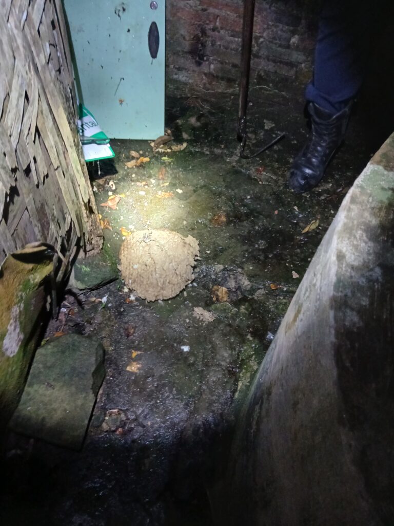 Benar saja, sarang tawon berdiameter hampir sebesar bola sepak ditemukan menempel di lantai dekat tembok rumah. Kondisi lokasi yang sempit dan gelap membuat proses evakuasi tidak mudah. Dengan bantuan penerangan senter dan peralatan khusus, petugas secara hati-hati mendekati sarang tersebut agar tidak memicu serangan tawon yang agresif.