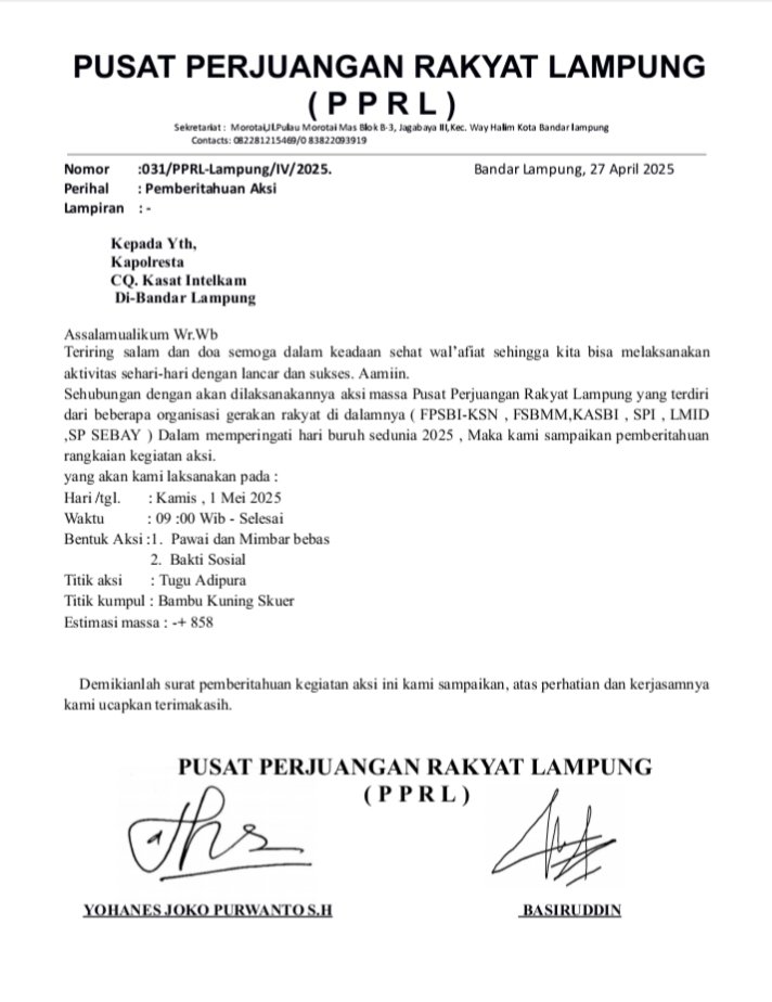 Dalam rangka memperingati Hari Buruh Internasional atau May Day yang jatuh pada 1 Mei 2025, Pusat Perjuangan Rakyat Lampung (PPRL) akan menggelar serangkaian aksi damai yang melibatkan estimasi massa sekitar 858 orang. Aksi ini merupakan bentuk solidaritas dan penyampaian aspirasi para pekerja di tengah berbagai persoalan ketenagakerjaan yang masih membelenggu buruh di Indonesia, khususnya di Lampung.
