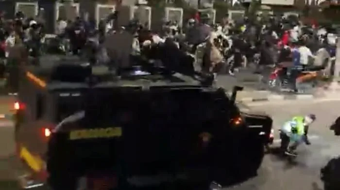 Rekaman amatir yang beredar di media sosial X memperlihatkan detik-detik mengerikan. Rantis berwarna hitam itu terlihat menerobos kerumunan, sementara massa berteriak histeris.