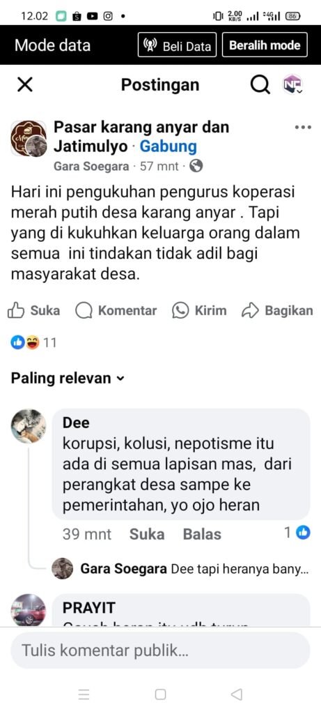 “Hari ini di balai desa ada musyawarah desa terkait pembentukan koperasi, tapi calon pengurusnya sudah ditentukan dan tanpa seleksi,” ungkapnya di kolom komentar.